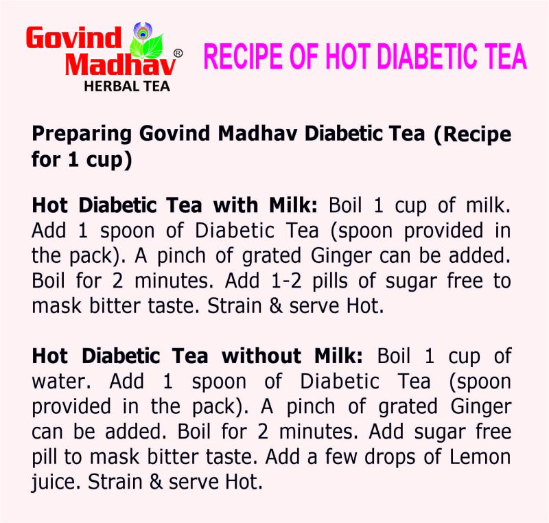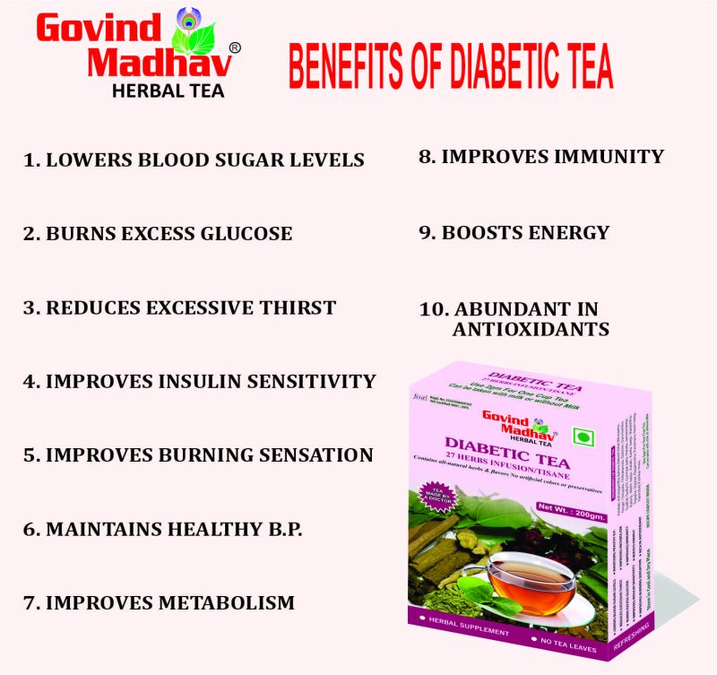Govind Madhav Diabetic Tea contains 27 herbs which have many Health Benefits including control of Diabetes when used in addition to regular routine remedies. This is because of Medicinal and Antioxidant properties of herbs. These herbs Lower Blood Sugar levels, Burn excess Glucose, reduce Excessive Thirst, improve Insulin Sensitivity, improve Burning Sensation, maintain Healthy B.P. improve Metabolism, improve Immunity, boost Energy.
