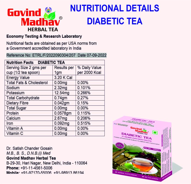 GOVIND MADHAV DIABETIC TEA - 27 HERBS - ACTIONS IN SHORT